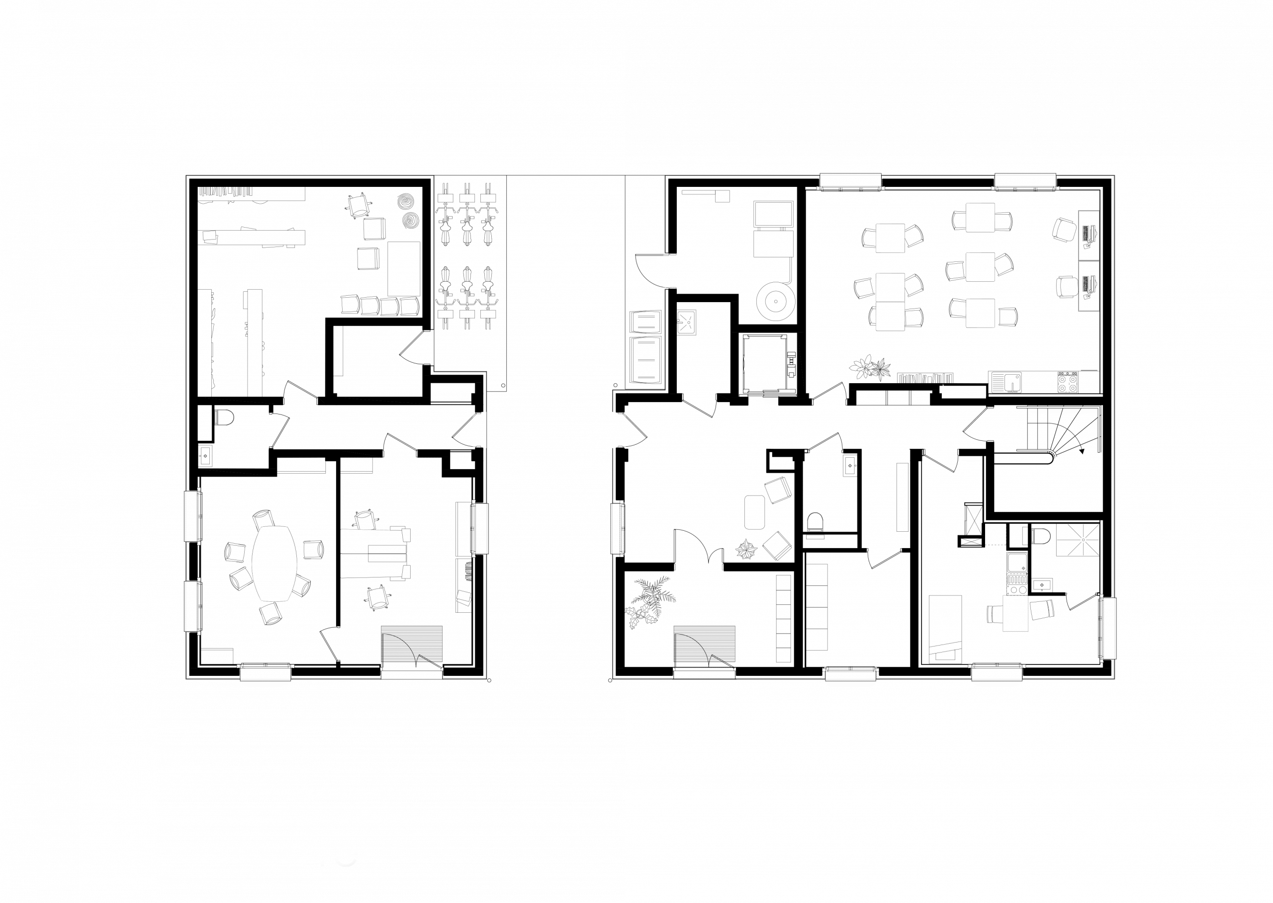 Le volume du bâtiment est simple, sur un plan rectangulaire, le long de la rue Saint Jean. Les espaces partagés se trouvent au rez-de-chaussée et les logements dans les étages. Pour accéder au jardin et aux places de parking, à l’arrière du bâtiment, studaré ouvre un passage cocher qui scinde le rez-de-chaussée en deux. Cette percée entre la rue et le jardin crée une distinction claire entre l’espace administratif et les espaces communs des résidents. Deux fenêtres, dans le passage, assurent une communication visuelle entre les espaces résidents et administratifs.